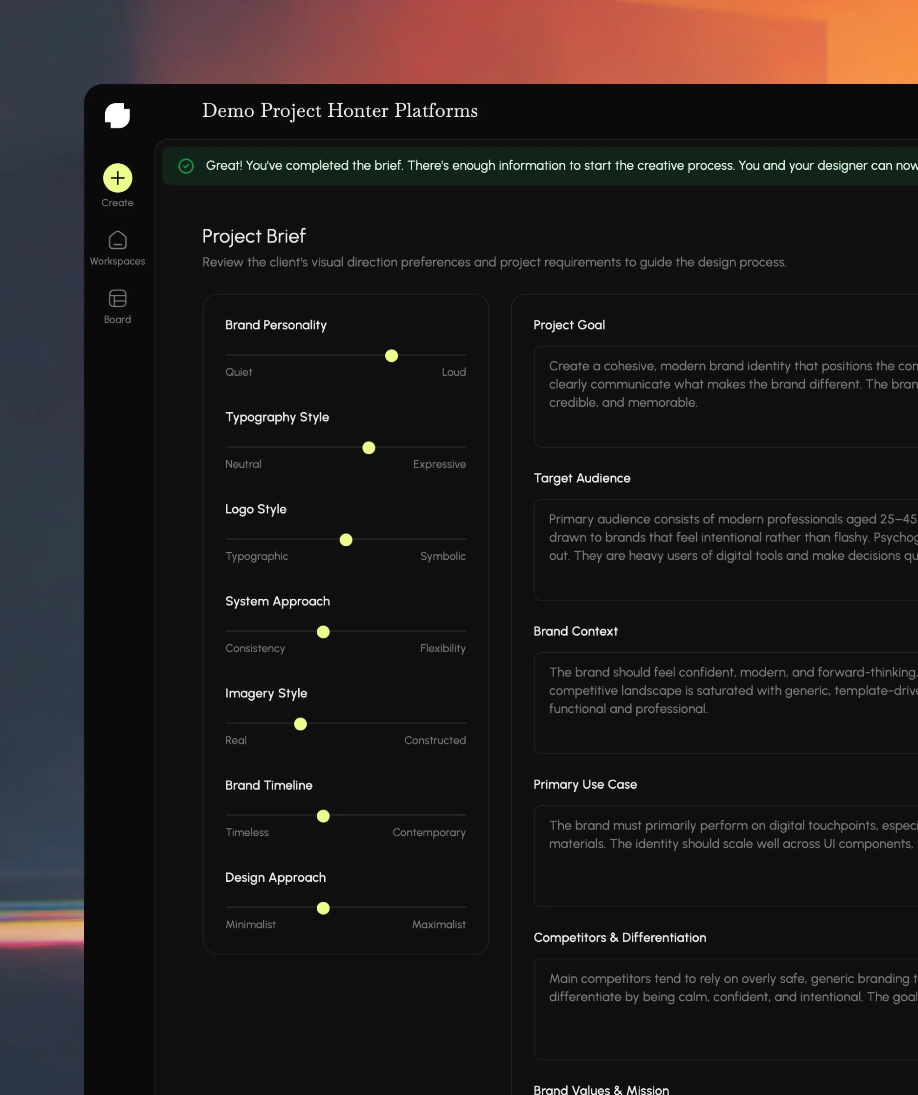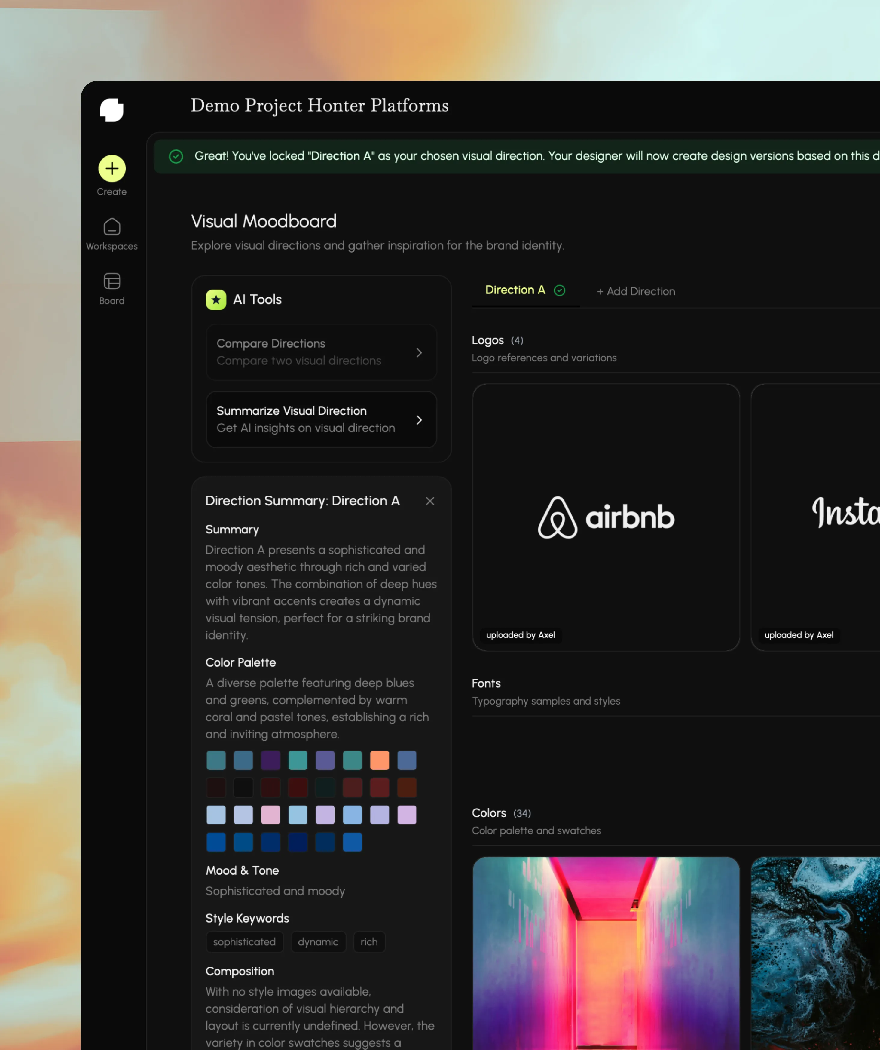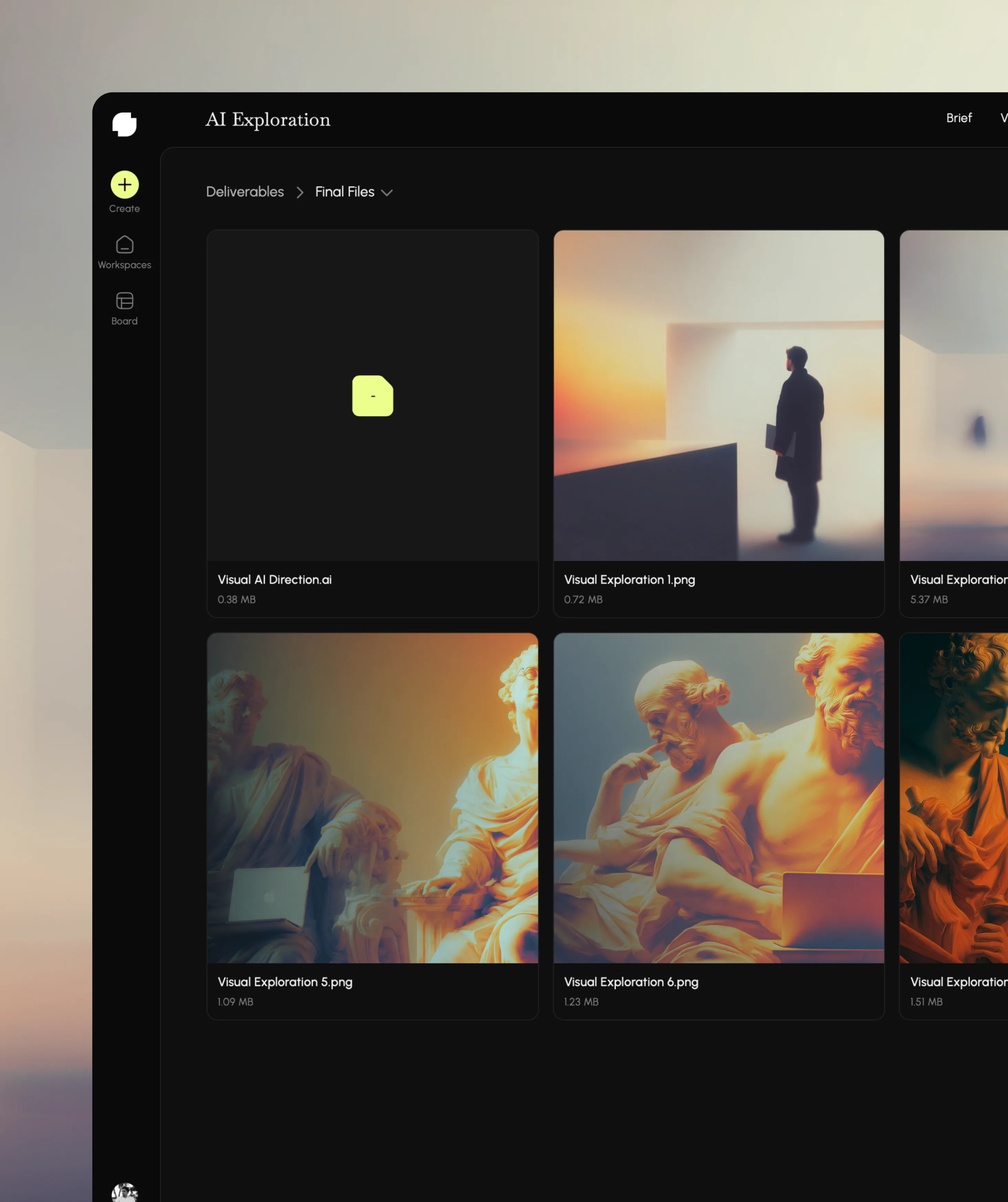 Workspaces designed around real design work across branding, web, and ongoing tasks.